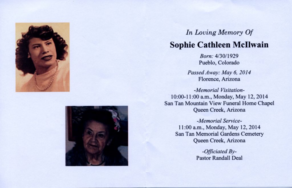 Sophie C. McIlwain 85, born April 30, 1929 in Pueblo, Colorado left to be with Jesus on May 6, 2014. Survived by her seven children, Pat Tuttle (Bill) of Gilbert, Arizona, Bill Robles Jr. (Louise) of Pueblo, Colorado, Linda Herrera of Fairfield, California, Kathleen Hunter (Terry) of Florence, Arizona, Brenda Robles of Avondale, Arizona, John Robles (Linda) of Vacaville, California, and Louis Robles (Sandra) of Chula Vista California. Brothers Joe Diaz of Pueblo, Colorado, Leo Diaz (Hope) of Pueblo, Colorado, Richard Diaz of Abilene, Texas and sister Irene Carillo (Fred) of Northglenn, Colorado. Sophie has 18 grandchildren, 16 great grandchildren and 2 great-great grandchildren. Numerous loving nieces and nephews, who lives she touched ever so deeply. Proceeded in death by her parents Conception and Leo Diaz, Brothers Luther, Manual, and Joaquin, and Sisters Elaine Cruz and Vera Apodaca and Son-in-law Paul Herrera. Sophie was a licensed Psychiatric Technician in the state of Colorado and California, and a certified Physical Therapist Assistant. Sophie retired from the State of California in 1991. She moved to Arizona in 2005. She enjoyed spending time with her grandchildren, shopping at Wal-Mart, and having dinner at Denny’s. She taught her daughters to be strong and independent, her sons to be caring and kind husbands. Her grandchildren to sing songs, love music, and to be happy, and encouraged them to be creative and loved them, she taught them “sometimes life was going to be hard but in the end everything will be alright.”Services for Sophie are on May 12, 2014 at San Tan Mountain View Funeral Home, in Queen Creek AZ. 21809 S Ellsworth Rd. At 11:00 am, reception to follow.